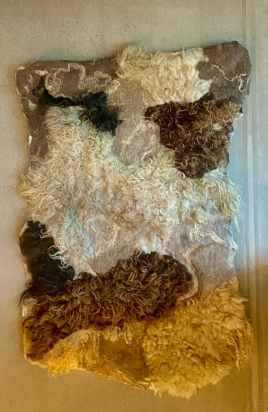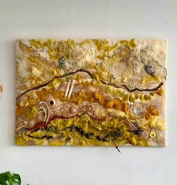 Toen ik in 2014 op Terschelling ben komen wonen is er een grote droom van mij in vervulling gegaan. Een eigen atelier, waar ik naar hartelust kon experimenteren met wol en strandvondsten. Als kind al kon ik uren op het strand naar schelpjes en stukjes hout zoeken. Met wol kwam ik pas in aanraking toen ik ergens een schapenvacht ging vilten, daarna is wol voor mij steeds meer gaan leven. In mijn atelier hier op Terschelling kan ik met beide aan de slag en ontstaan er vaak mooie en bijzondere combinaties. Na het afronden van de tweejarige viltopleiding bij de Dutch Felt Academie in 2017 ben ik workshops gaan geven. Daarvoor had ik al een aantal jaren deelgenomen aan een wol jaarwerkgroep, bij het Kleine Atelier in Franeker. Mijn atelier op Terschelling is een heerlijke plek waar ik me kan uitleven en mensen kennis kan laten maken met de wondere wereld van wol. Er valt nog zoveel te ontdekken! Zo wil ik mezelf nog gaan verdiepen in het ecoprinten en het verven van wol met planten. Mijn grote inspiratiebron is de natuur om mij heen. Dagelijks mag ik daar de dynamiek van de zee, de wind en de steeds veranderende structuren in het landschap ervaren. Iedere week ben ik wel een keer op het strand te vinden. Aangespoelde stukken hout, botjes of gekke plastic voorwerpen gaan allemaal mee naar huis (zo draag ik spontaan ook mijn steentje bij aan het milieujutten). Mijn viltwerk combineer ik dan ook vaak met strandvondsten.