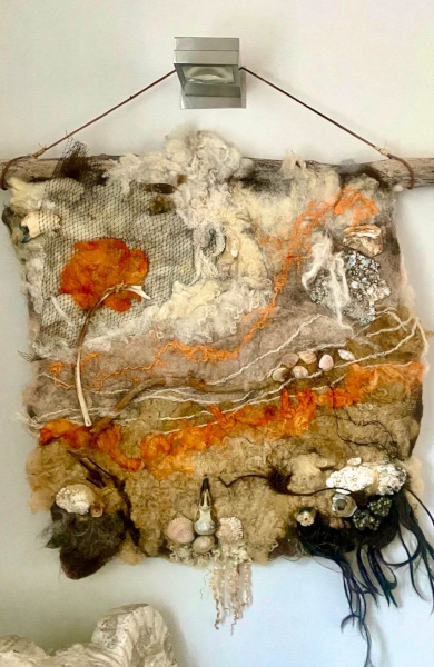 Toen ik in 2014 op Terschelling ben komen wonen is er een grote droom van mij in vervulling gegaan. Een eigen atelier, waar ik naar hartelust kon experimenteren met wol en strandvondsten. Als kind al kon ik uren op het strand naar schelpjes en stukjes hout zoeken. Met wol kwam ik pas in aanraking toen ik ergens een schapenvacht ging vilten, daarna is wol voor mij steeds meer gaan leven. In mijn atelier hier op Terschelling kan ik met beide aan de slag en ontstaan er vaak mooie en bijzondere combinaties. Na het afronden van de tweejarige viltopleiding bij de Dutch Felt Academie in 2017 ben ik workshops gaan geven. Daarvoor had ik al een aantal jaren deelgenomen aan een wol jaarwerkgroep, bij het Kleine Atelier in Franeker. Mijn atelier op Terschelling is een heerlijke plek waar ik me kan uitleven en mensen kennis kan laten maken met de wondere wereld van wol. Er valt nog zoveel te ontdekken! Zo wil ik mezelf nog gaan verdiepen in het ecoprinten en het verven van wol met planten. Mijn grote inspiratiebron is de natuur om mij heen. Dagelijks mag ik daar de dynamiek van de zee, de wind en de steeds veranderende structuren in het landschap ervaren. Iedere week ben ik wel een keer op het strand te vinden. Aangespoelde stukken hout, botjes of gekke plastic voorwerpen gaan allemaal mee naar huis (zo draag ik spontaan ook mijn steentje bij aan het milieujutten). Mijn viltwerk combineer ik dan ook vaak met strandvondsten.